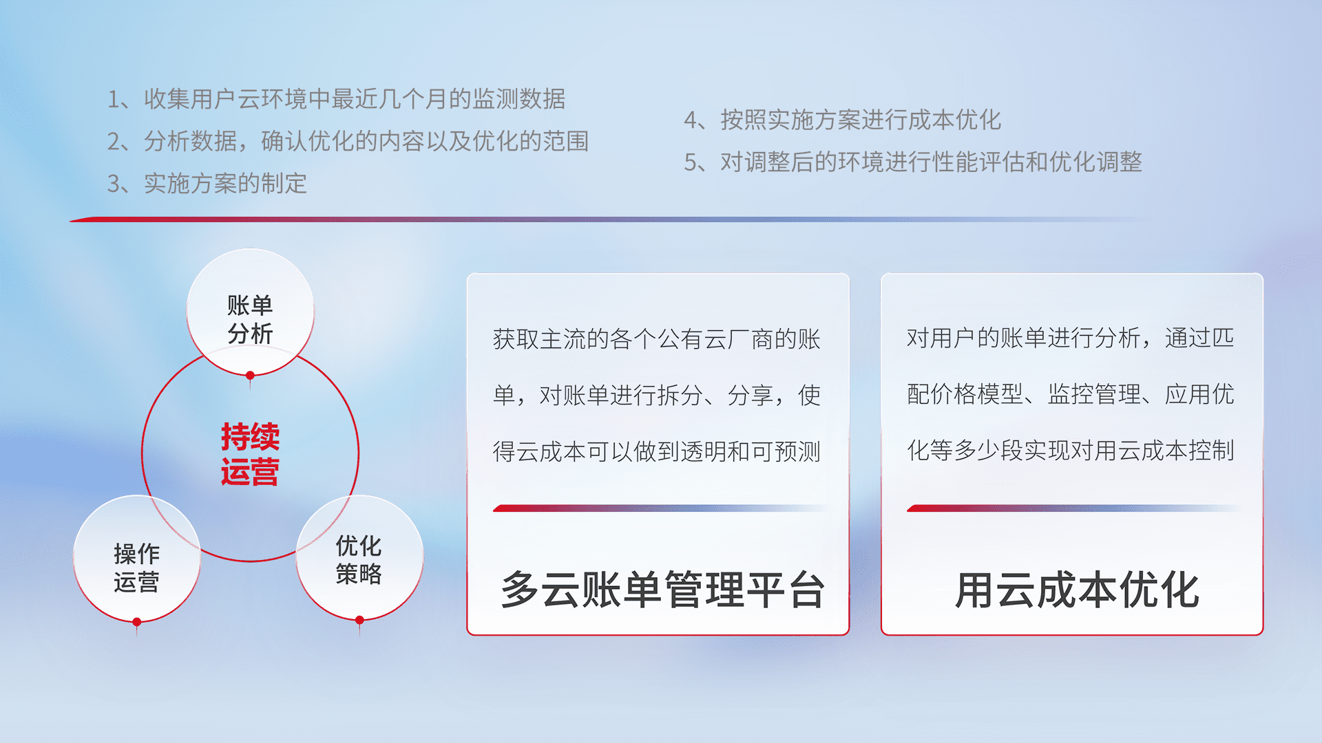 通过灵活运用多种自动化迁移工具,帮助企业用户实现业务和数据高效 、稳定的上云迁移和云上迁移,采用自研多云纳管平台,以中立管理模式,解决多组织、多云、多运维厂商的复杂关系的管理,保证多云平台资源配置的一致性,实时掌控云资源运行数据,运用智能化工具分析云资源多云平台的管理服务,透明化管理成本支出,用云成本可预测、用云费用可优化、云资源配额有据可依。
