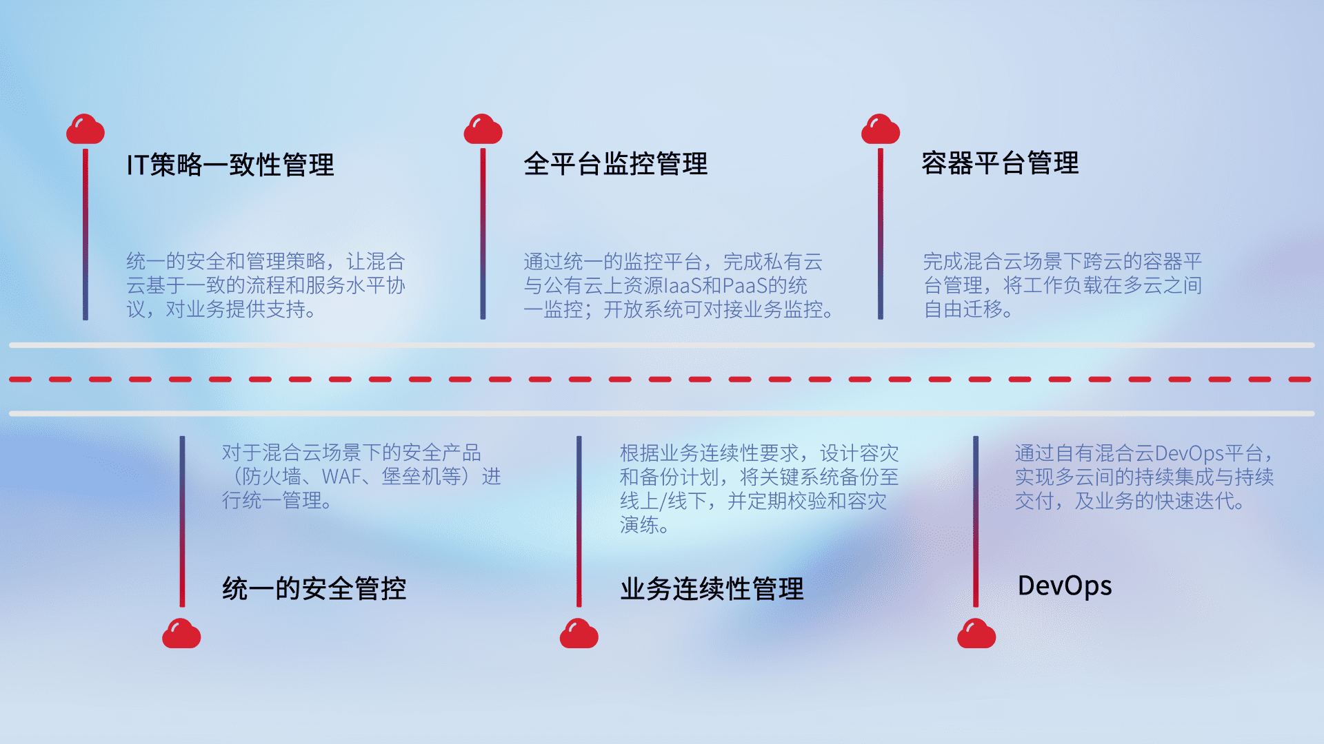 经过多年多云厂商经验积累,为企业混合云架构设计,建设,迁移及部署实施提供一站式服务。